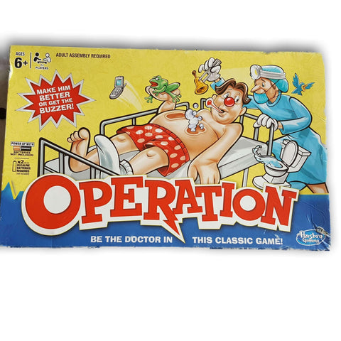 Operation is a dexterity game in which you must extract silly body parts from a hapless patient. In the course of the game you acquire cards which dictate that you must remove a certain piece from the body of the patient. To do this you use a set of tweezers that are attached by wire to the game board. If you are sloppy and touch the metal sides of the hole where the item is located, the patient's pain is indicated by a sudden buzzer and light-up nose. Successful extractions net cash, and the player with the most cash at the end of the game is the winner.